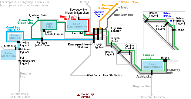 מלבד האוטובוסים המיועדים לתיירים, פועלת באזור גם רשת של אוטובוסים רגילים, שיכולים לשמש להגעה ליעדים מרוחקים יותר כמו Lake Shojiko ו-Lake Motosuko, וכן לכיוון Oshino, Lake Yamanakako, ו-Gotemba.